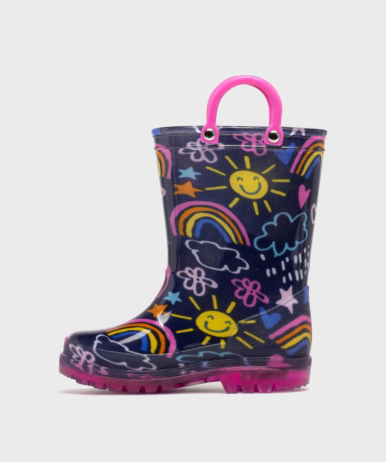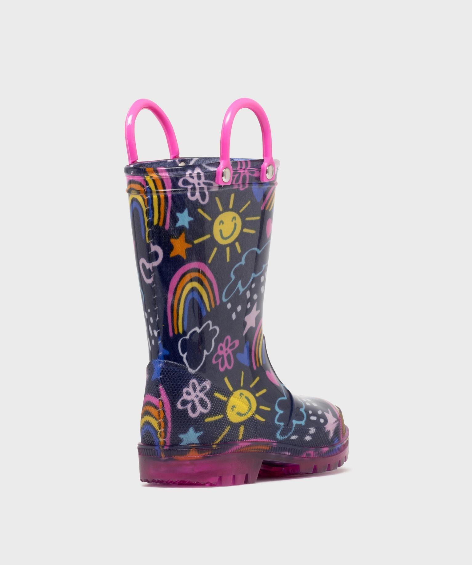 Mettez de la joie dans les journées de pluie avec ces superbes bottes de pluie fille à semelle lumineuse ! Les bottes imperméables sont parsemées de motifs colorés. Les enfants apprécieront les deux anses en haut de tige qui permettent d'enfiler facilement les bottes et la semelle crantée antidérapante. Simples à enfiler, ces bottes en caoutchouc se portent avec une tenue imperméable ou un jean.