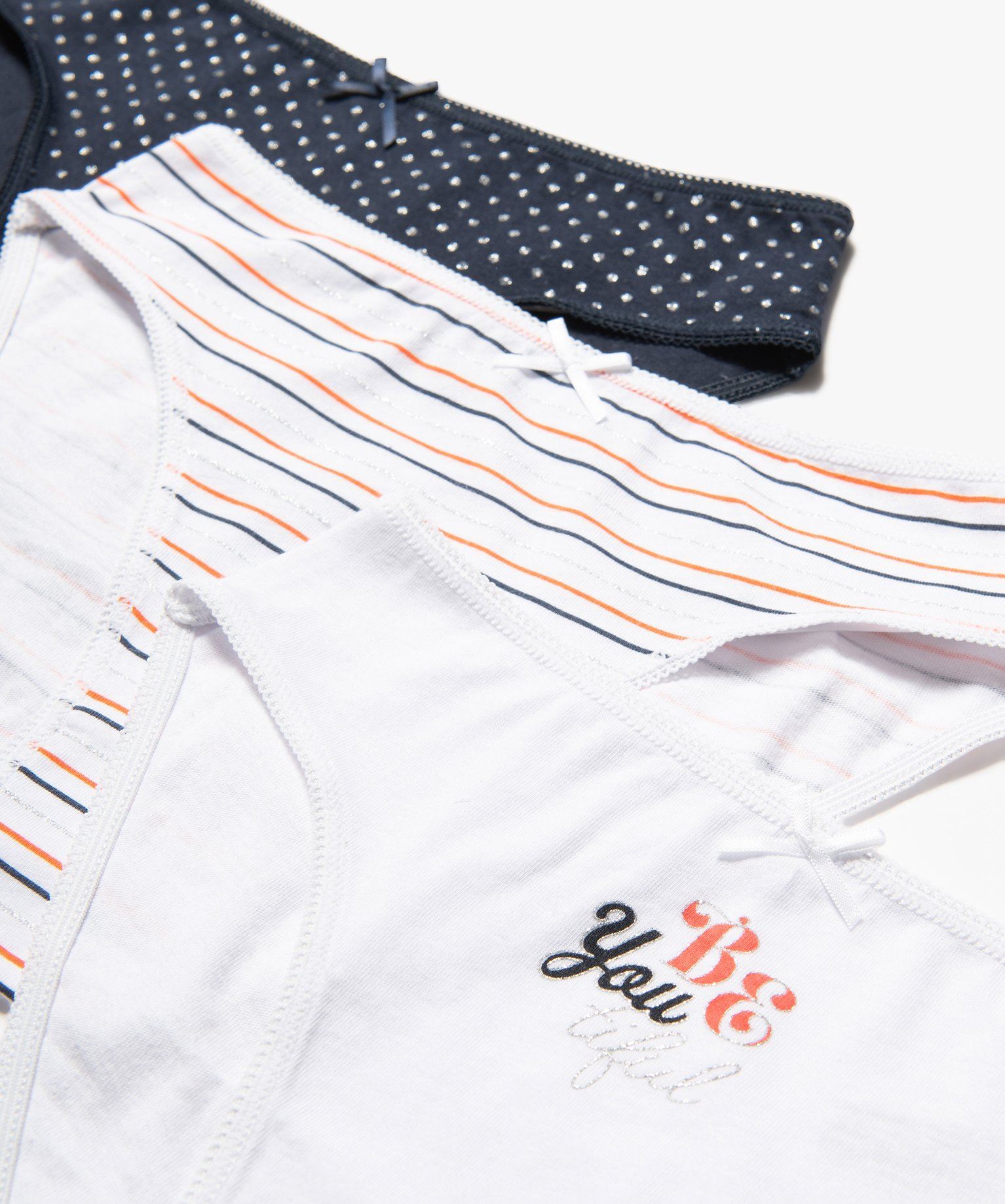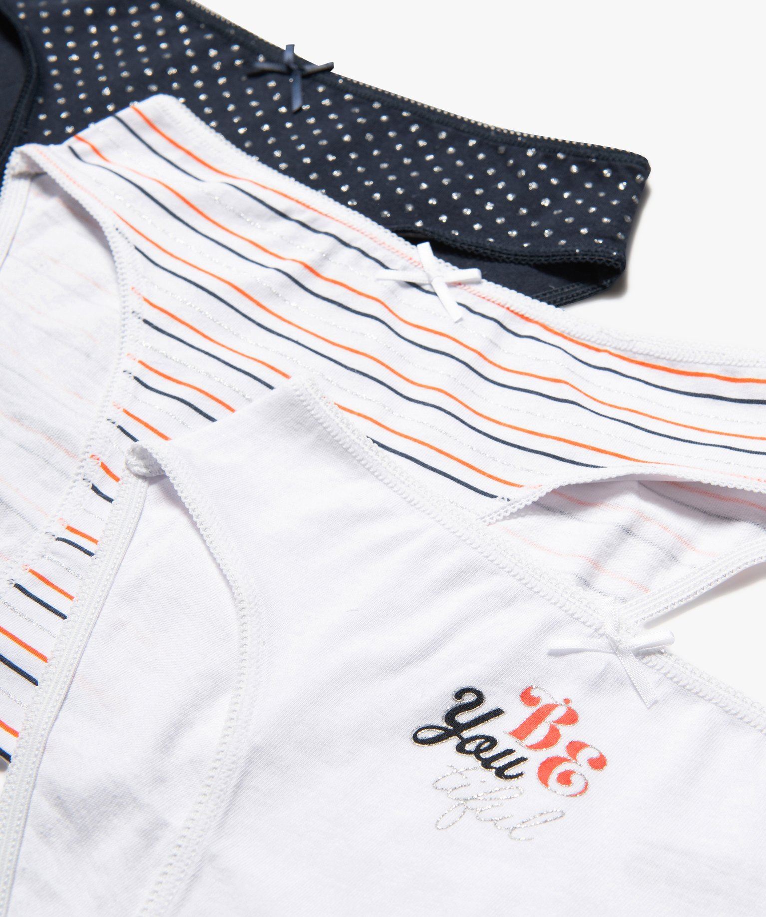 Un lot de culottes pour fille à glisser sans attendre dans le vestiaire ! Ces jolis sous-vêtements sont illuminés par des détails pailletés. Conçues pour offrir un confort optimal, ces culottes sont confectionnées en coton biologique ultra doux. Elles sont disponibles dans des couleurs tendance. Ces slips en coton se glisseront aisément sous n'importe quel vêtement, en toute discrétion. Ils sont dotés d'une ceinture élastique et décorés d’un petit noeud satiné à la taille.