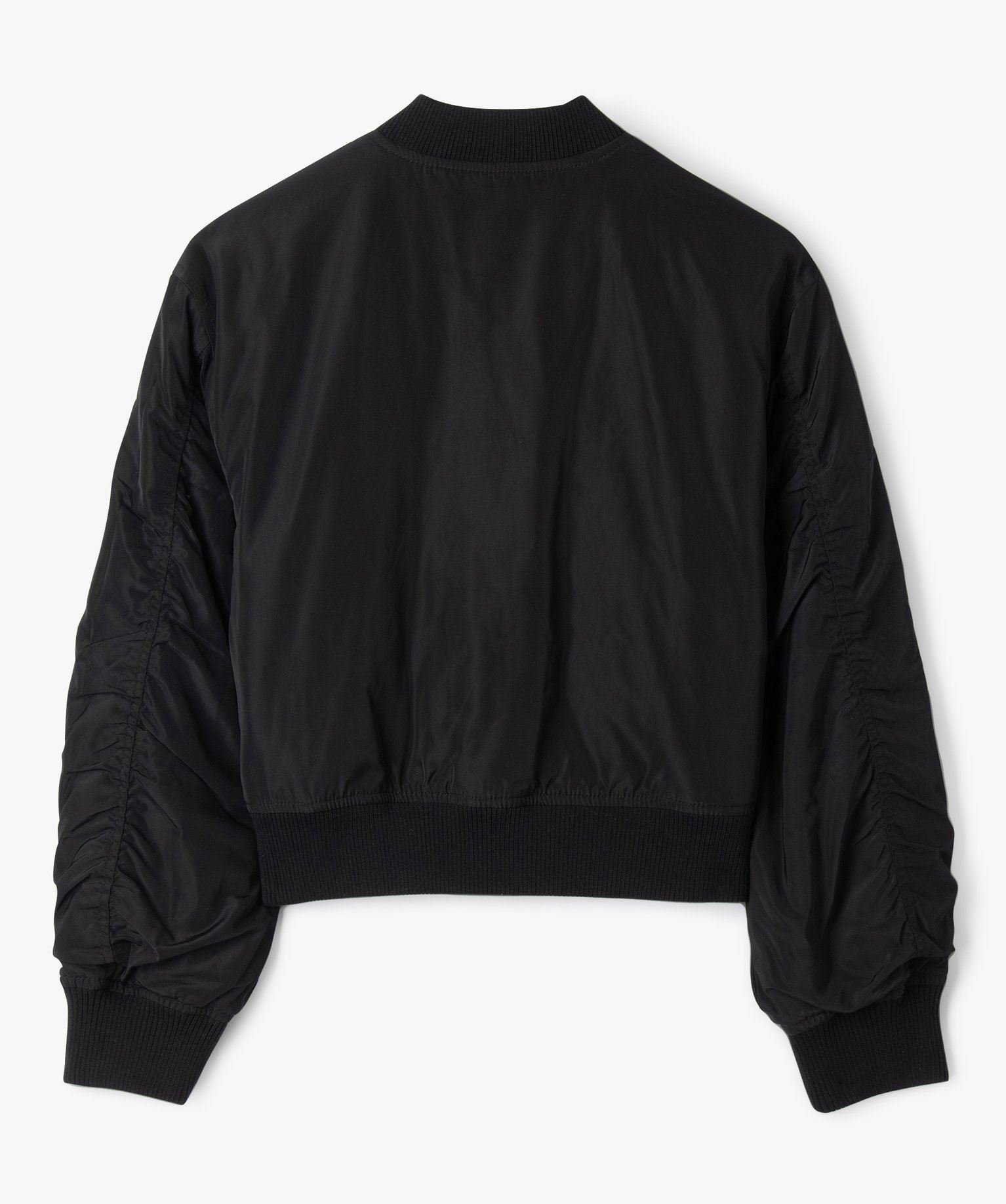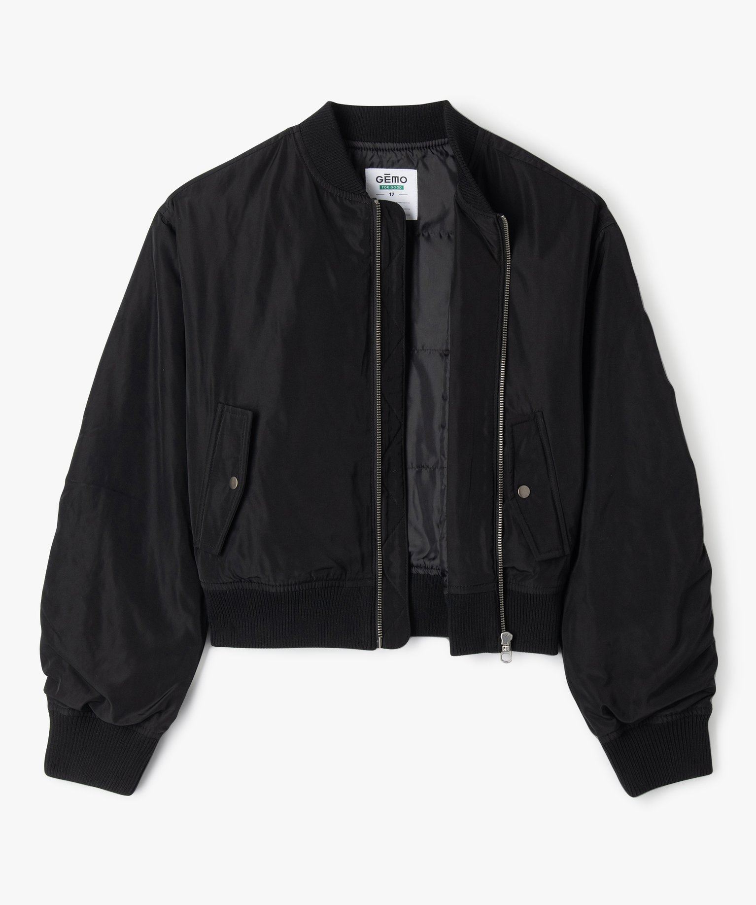 Gémo revisite le célèbre et indémodable blouson bomber dans une version ultra tendance : le bomber cropped ! Un blouson fille qui respecte tous les codes du blouson aviateur... mais dans une version courte irrésistible. Le blouson se ferme à l'aide d'un zip. Il possède 2 poches à rabat pressionné. Le col, le bas et les poignets sont en large bord-côte élastique. Le manteau est finement rembourré. Sa matière offre un toucher satiné.