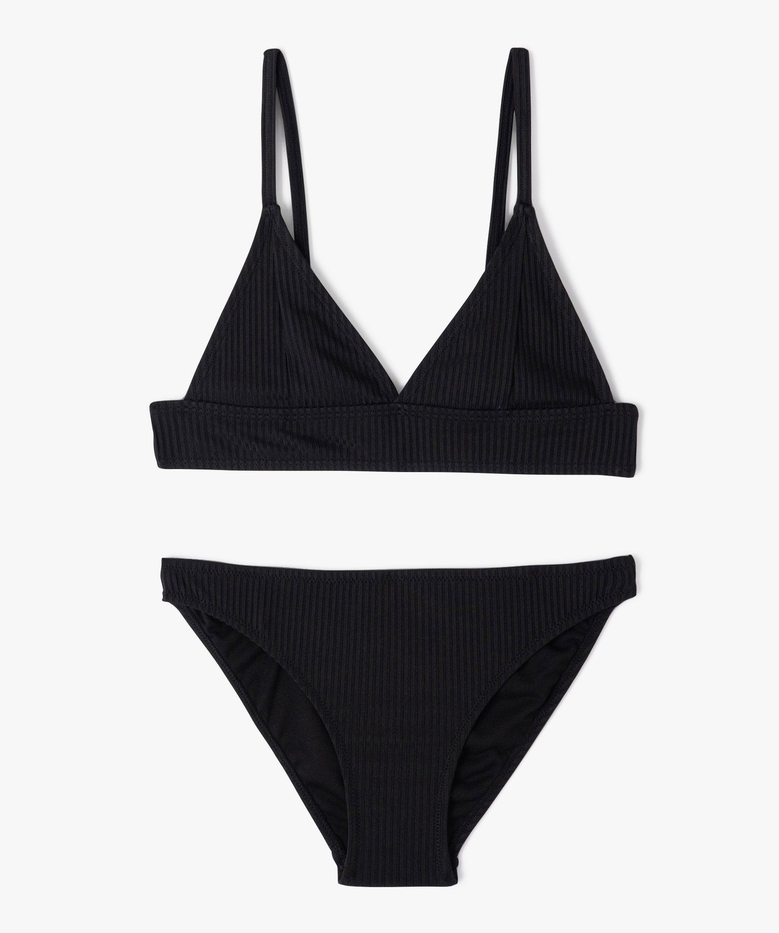 Ce maillot de bain 2 pièces séduira les ados à coup-sûr ! Confectionné dans une maille affichant des rayures ton sur ton et des reflets satinés, il affiche un look sobre et chic. Ce maillot de bain fille se compose d’un haut triangle à enfiler comme une brassière et d’un bas forme slip. Un maillot de bain doublé aux finitions de qualité.