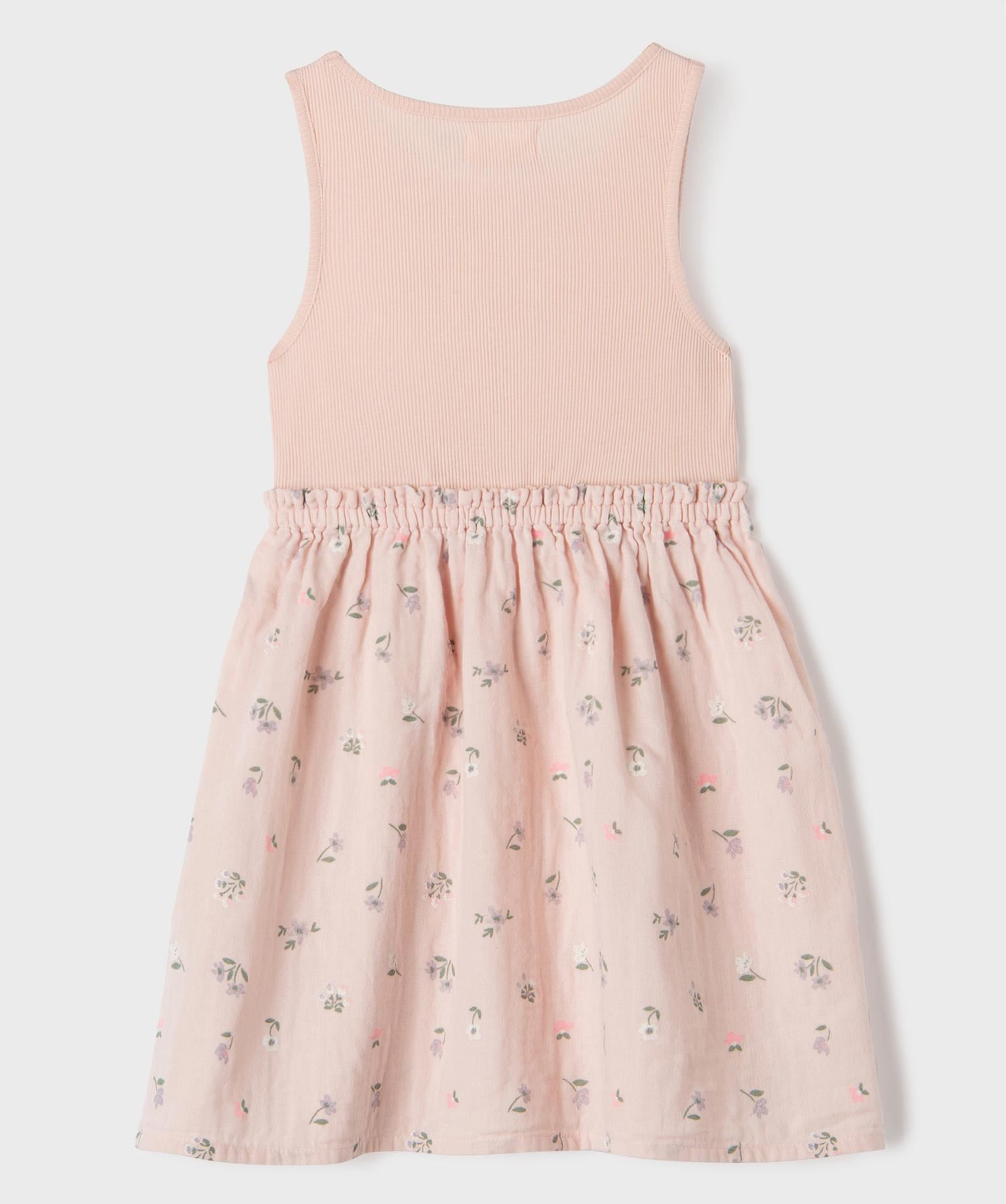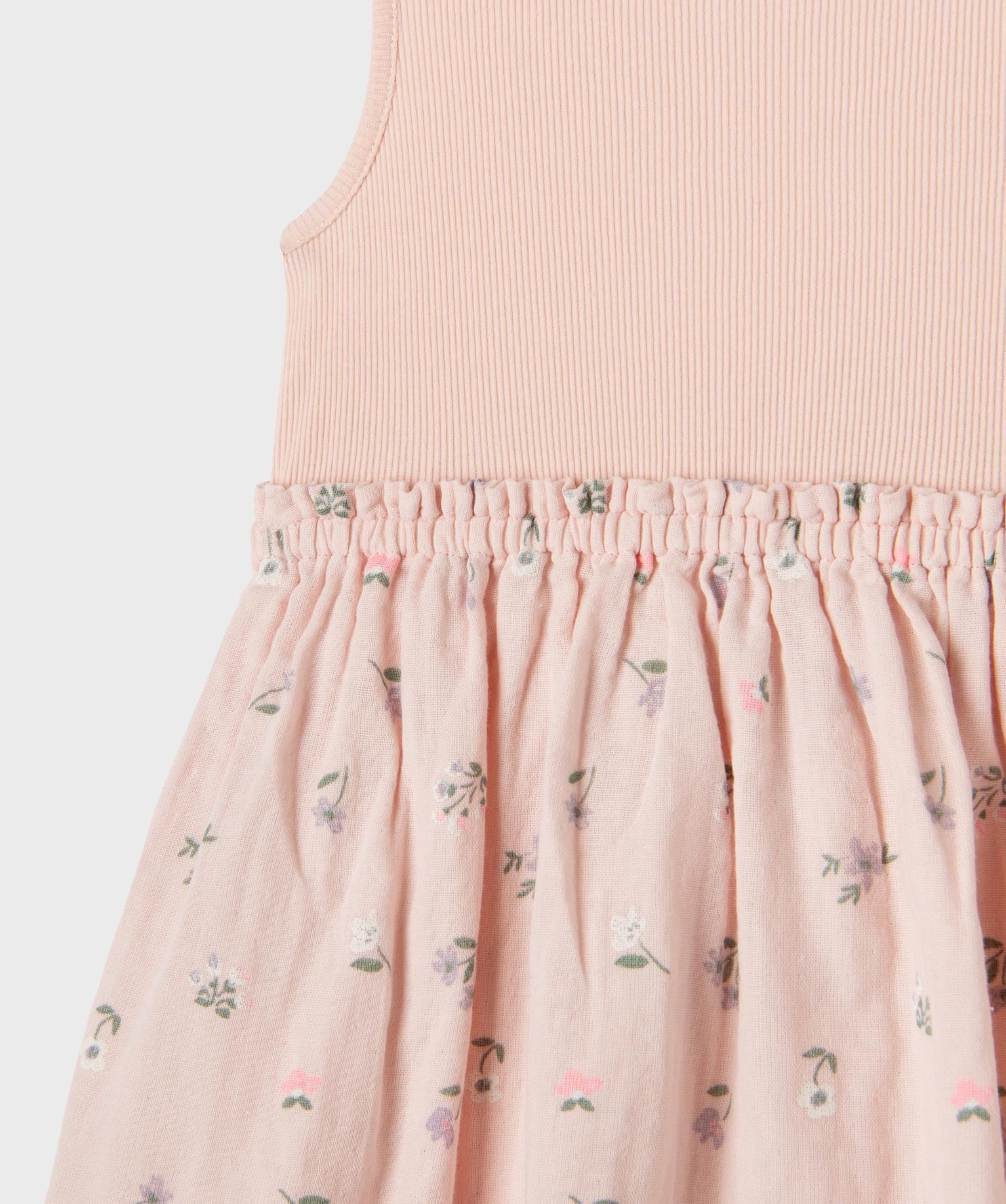 Cette robe fille allie confort et élégance avec son haut débardeur en maille côtelée qui épouse délicatement la silhouette et sa jupe en gaze de coton à motifs fleuris, légère et aérienne. Les fronces à la ceinture permettent de souligner la taille avec élégance. Cette robe en coton, facile à enfiler, assure aux petites princesses une silhouette fluide et gracieuse. Un modèle à la fois pratique et raffiné, idéal pour la saison estivale, à porter tout l’été avec une paire de sandales.