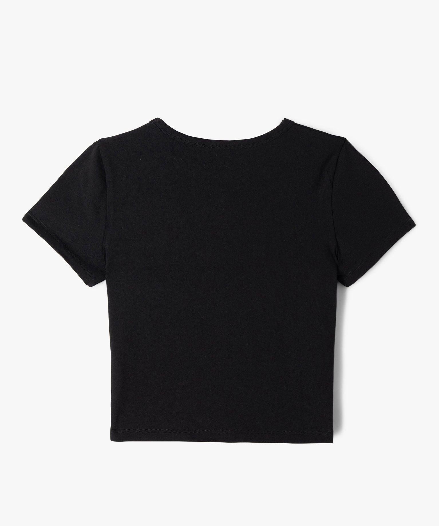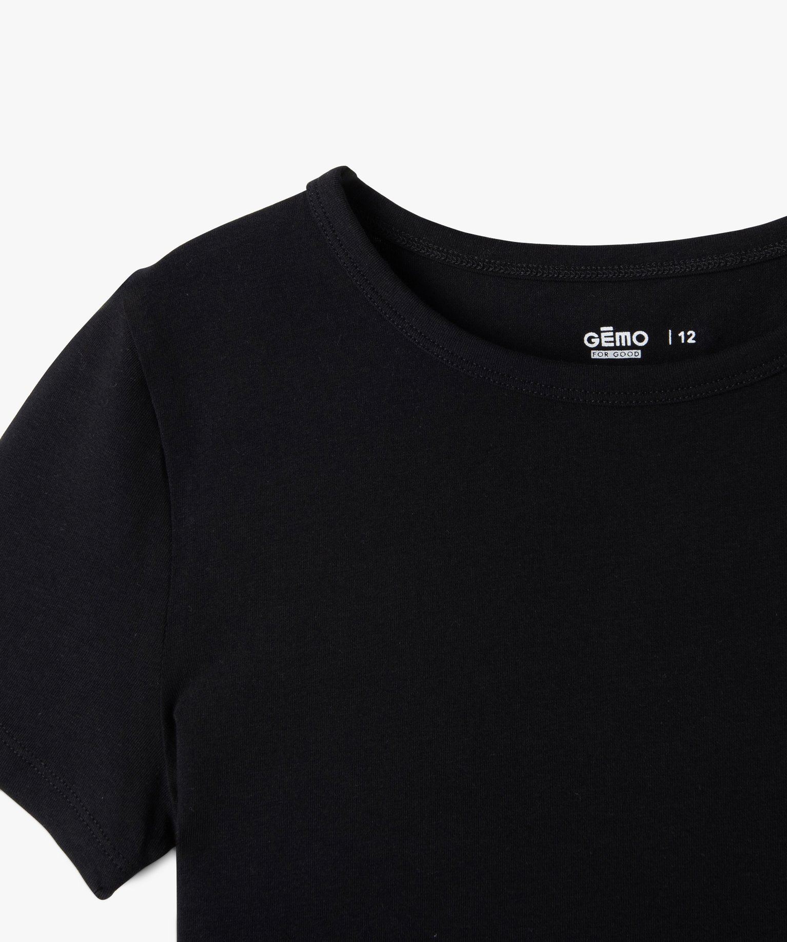 Toujours plébiscité par les ados, le tee-shirt court permet de créer des looks tendance au quotidien. Ce tee-shirt fille séduit par son look sobre : coupe ajustée, col rond et coloris uni facile à assortir. Ce tee-shirt à manches courtes se porte seul, sous une chemise ouverte ou sous un sweat. Col rond finition biais.