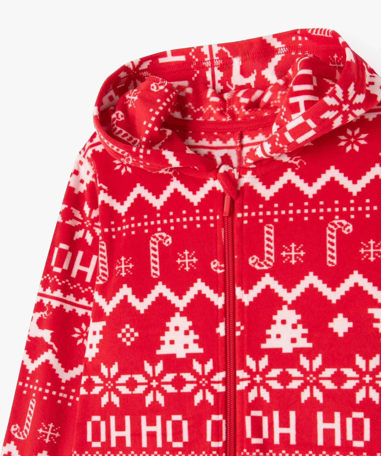 Pour des soirées toute douces, particulièrement en fin d’année, offrez à votre enfant cette jolie combinaison pyjama à capuche. Un sur-pyjama en velours entièrement parsemé de motifs de Noël qui permet d’ajouter une touche de féérie dans le vestiaire homewear. Cette combinaison pyjama enfant s’enfile facilement grâce à un zip sur l’avant et possède des finitions en bord-côte aux poignets et aux chevilles.