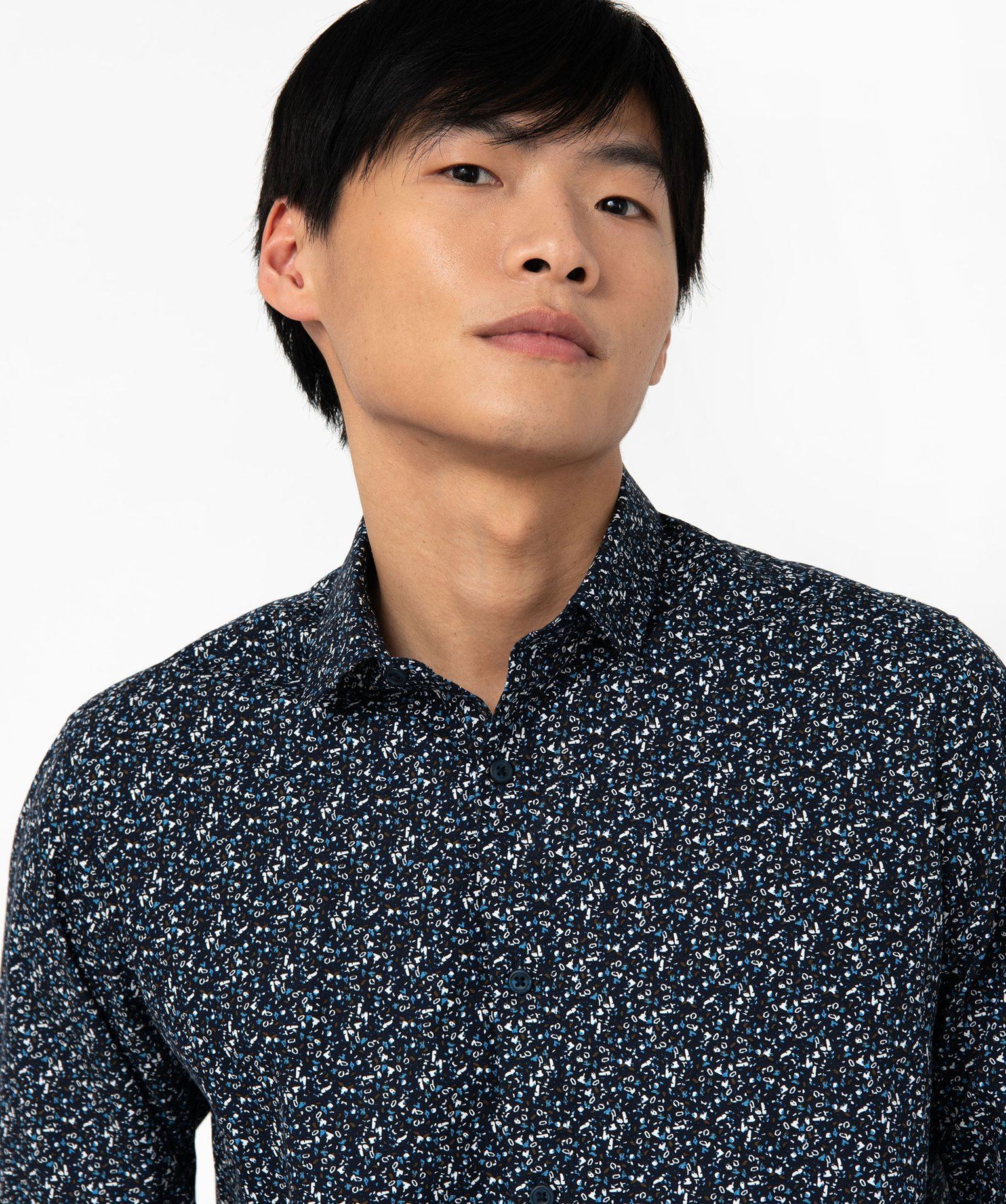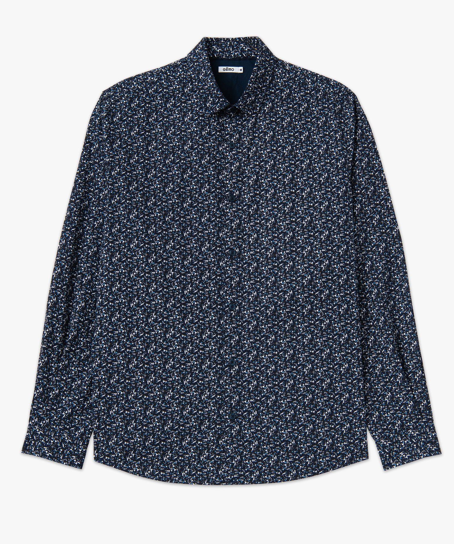 Élégante chemise homme en coton imprimé. Une chemise à manches longues et coupe droite qui apportera un touche d'originalité raffinée à vos pantalons unis. La chemise possède un col classique avec baleines souples intégrées pour un bon maintien, une fermeture boutonnée et une base arrondie. Les poignets carrés, doublés d'un tissu uni, se règle sur deux largeurs grâce à des boutons.