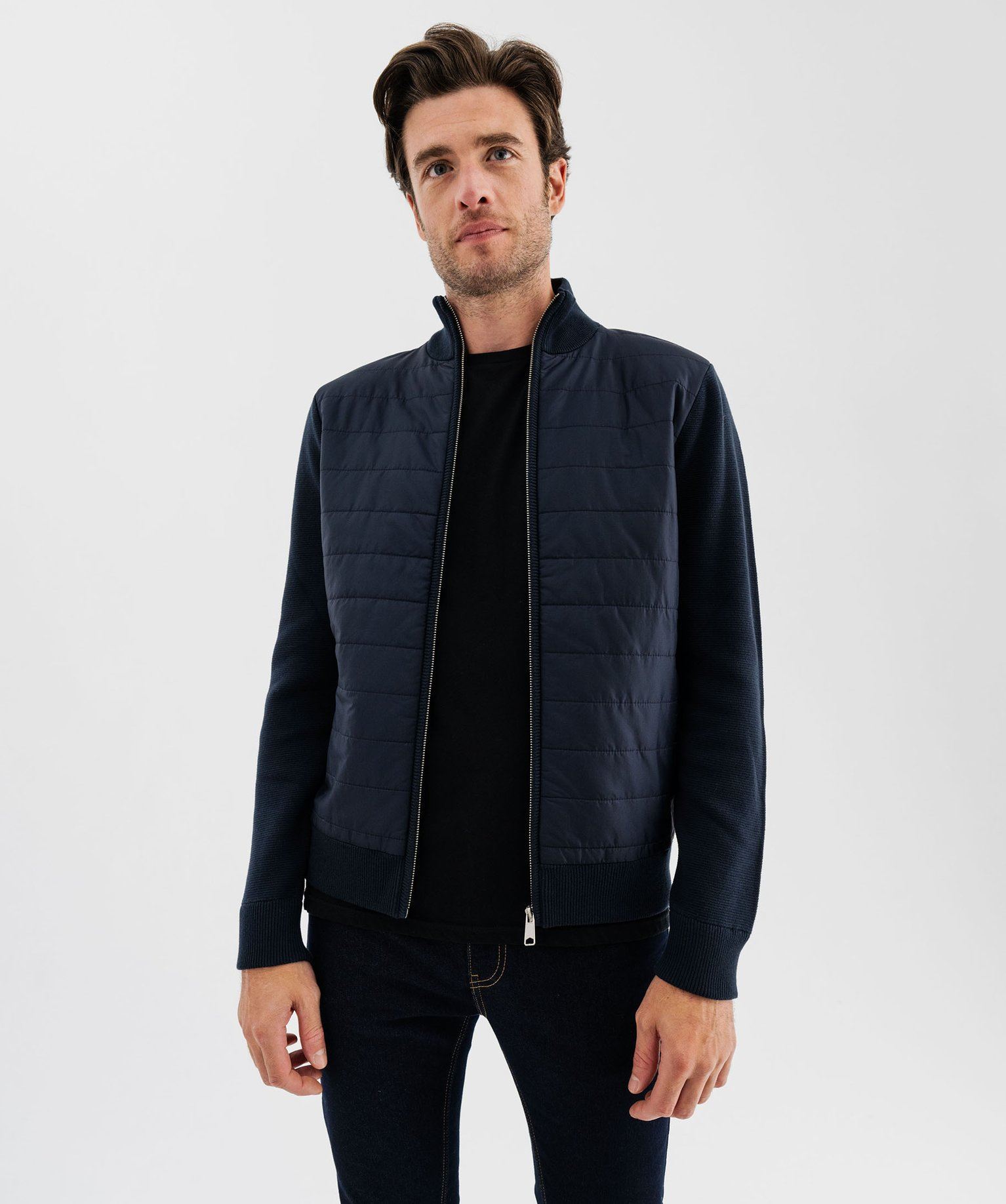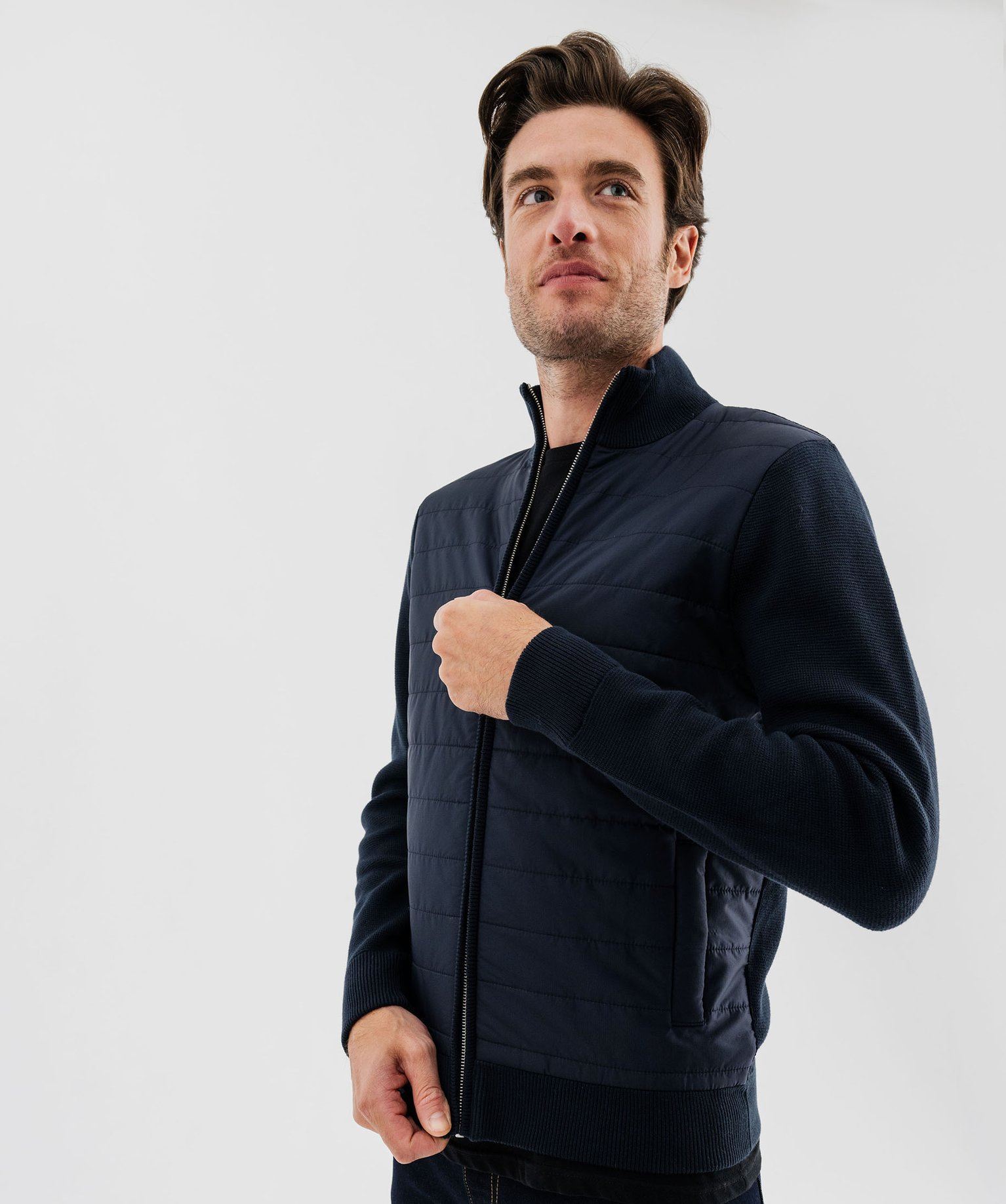 Ce gilet bimatière pour homme est original et pratique. Le dos, les manches et le col sont en maille classique, tandis que le devant est en toile matelassée façon doudoune. Il peut tout à fait se porter comme une veste pour les journées fraîches. Le gilet homme est doté d'un col montant et d'une fermeture zippée, Deux poches pressionnées apportent un côté fonctionnel. Finition en côtes 1/1 au col, aux poignets et dans le bas pour plus de confort. À associer avec un jean brut et des boots pour un look casual et moderne.