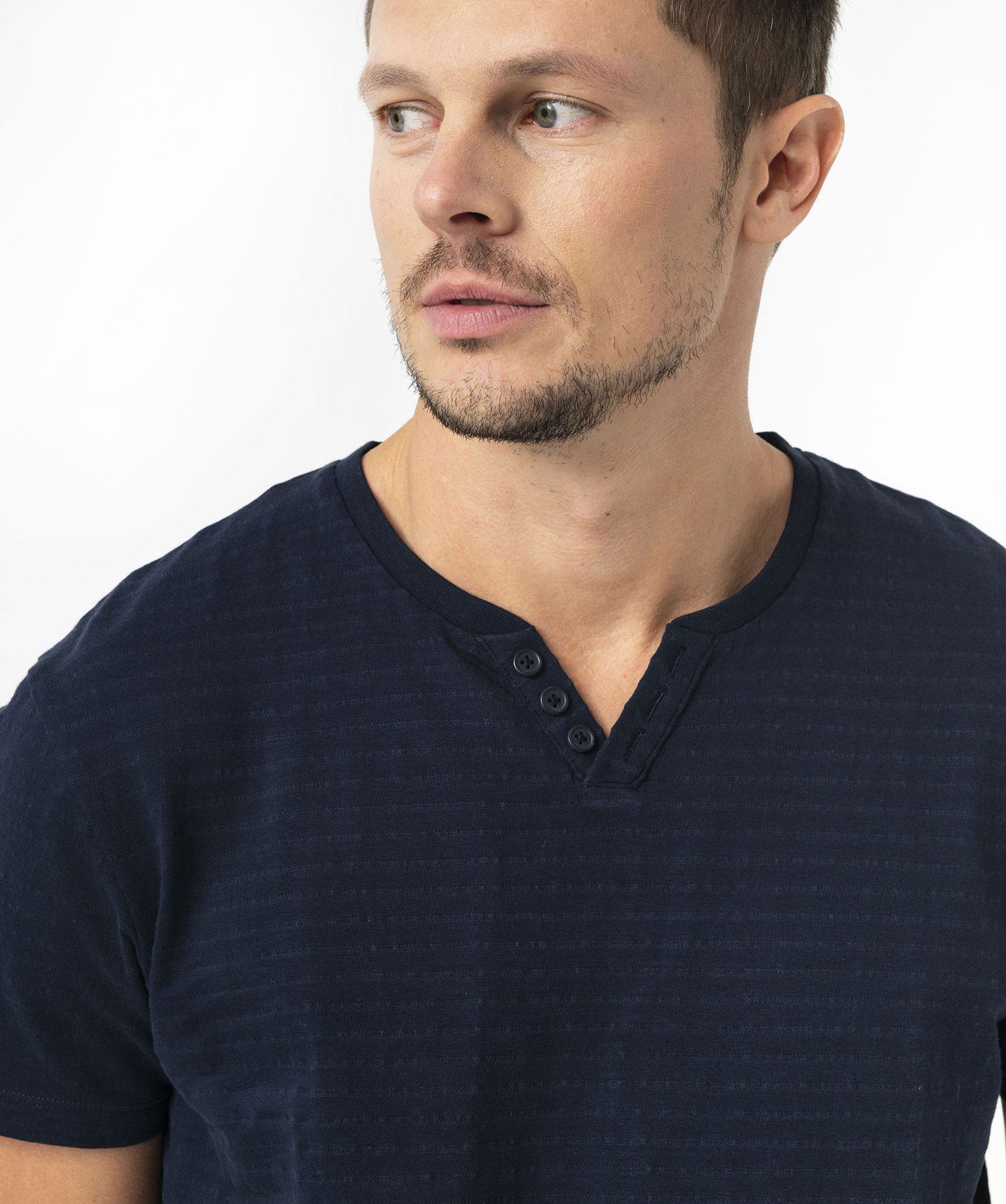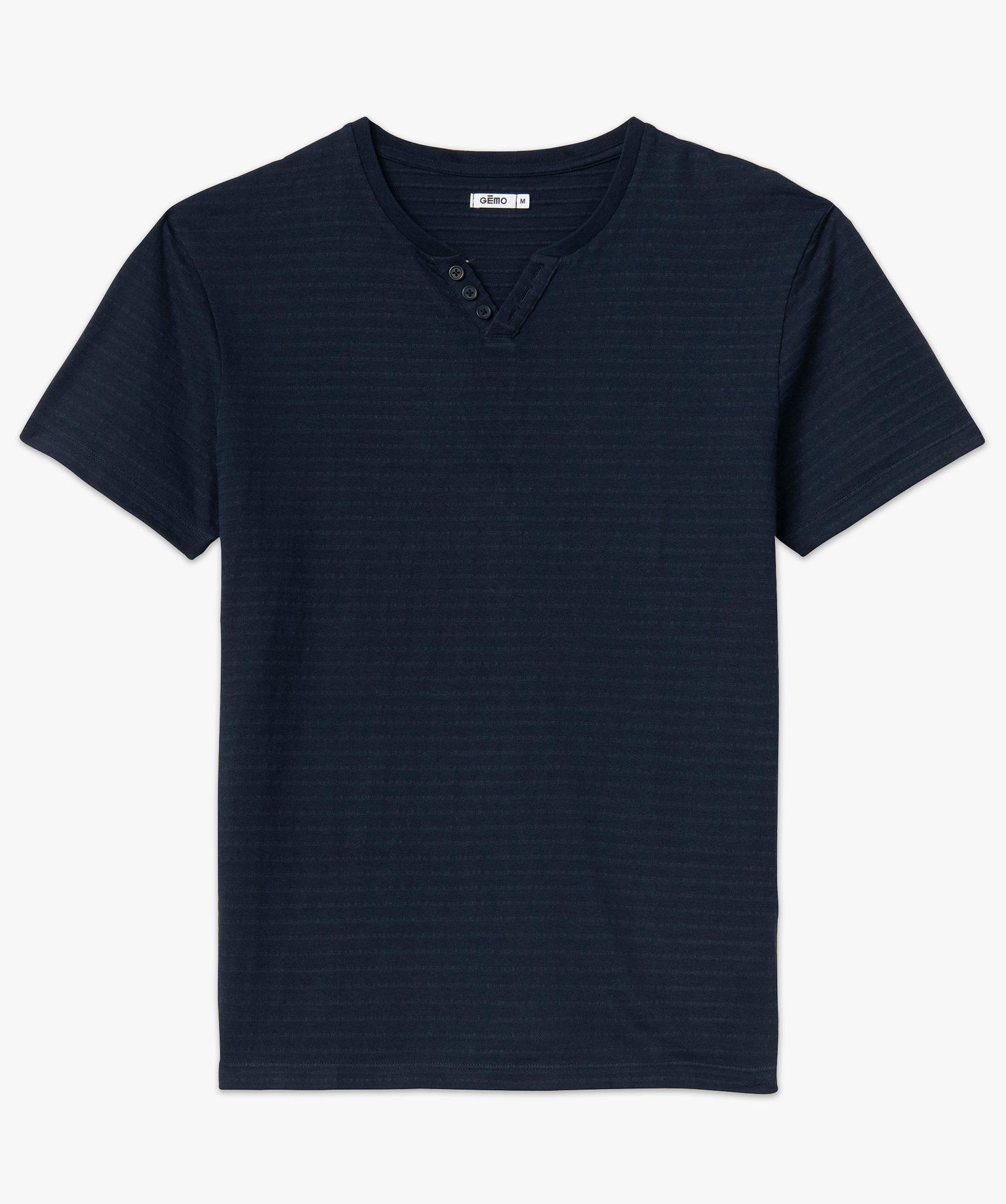 Le basique tee-shirt manches courtes se renouvelle et s'affiche ici avec un col fantaisie inspiré du col tunisien. Idéal pour mettre en valeur le port de tête. Le tee-shirt pour homme en maille jacquard se distingue par ses rayures en relief. Un tee-shirt à manches courtes 100% coton, idéal pour apporter un petit twist discret à vos pantalons et bermudas. Col en fin bord-côte uni.