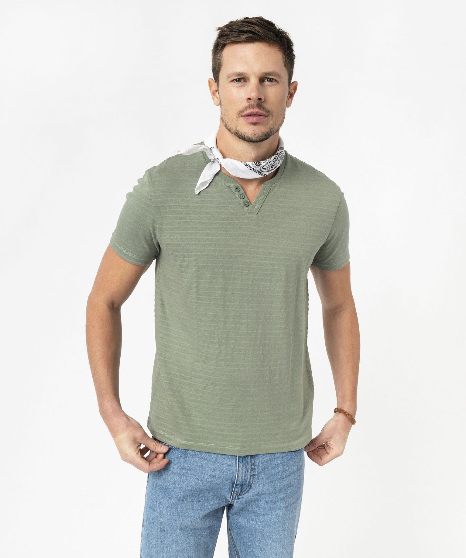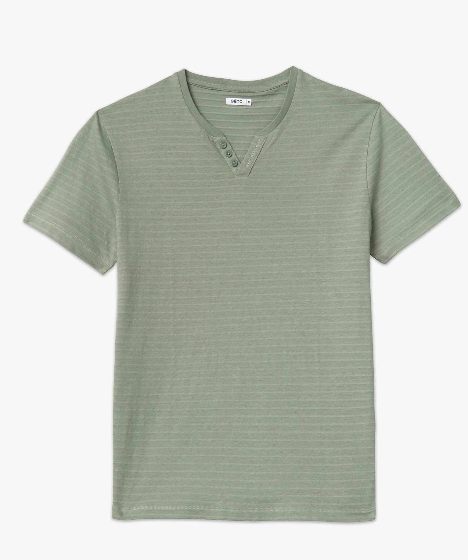 Le basique tee-shirt manches courtes se renouvelle et s'affiche ici avec un col fantaisie inspiré du col tunisien. Idéal pour mettre en valeur le port de tête. Le tee-shirt pour homme en maille jacquard se distingue par ses rayures en relief. Un tee-shirt à manches courtes 100% coton, idéal pour apporter un petit twist discret à vos pantalons et bermudas. Col en fin bord-côte uni.